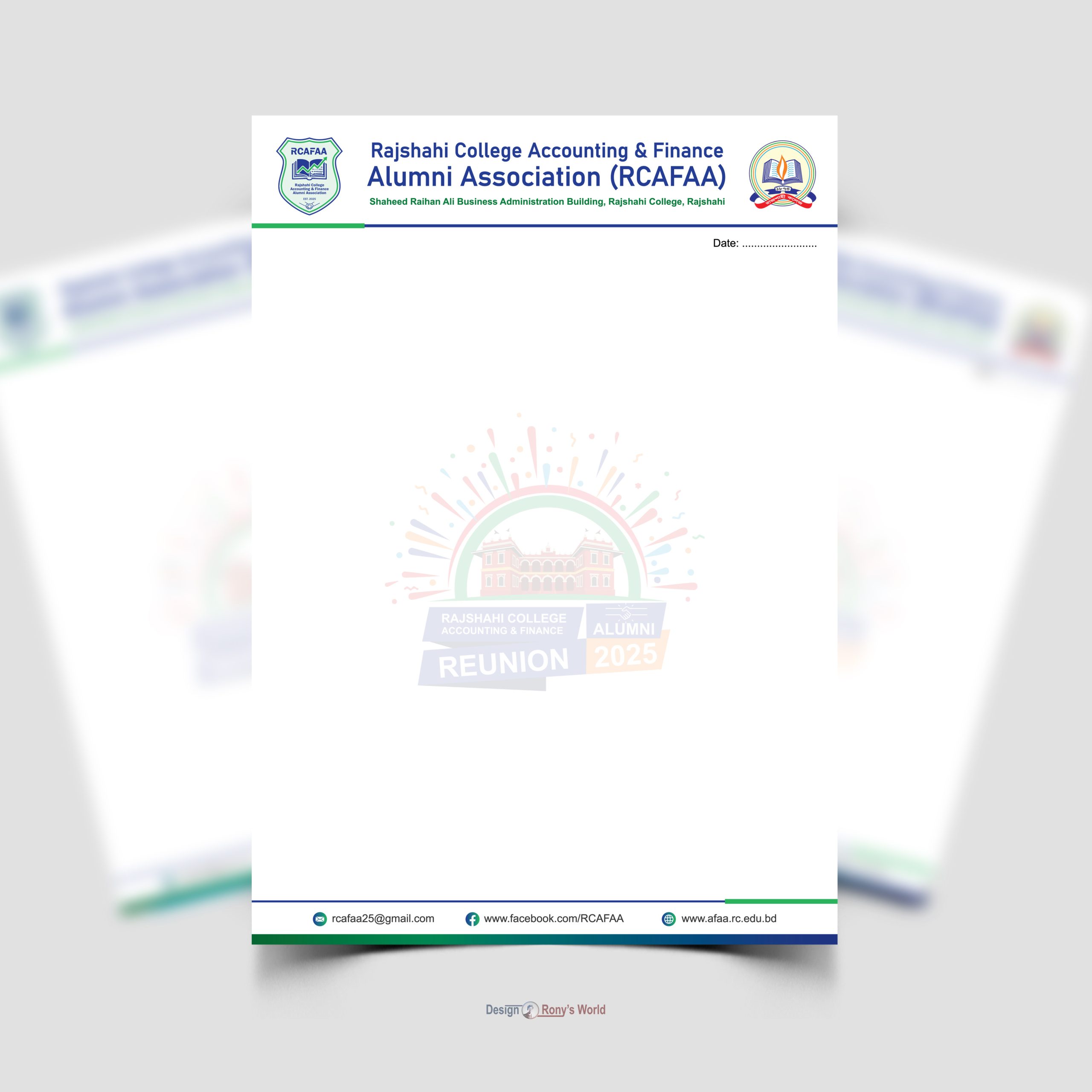 The newly letterhead pad designed by the ICT Committee reflects the identity, theme and heritage of RCAFAA, maintaining its official colors, representing elegance, unity and the proud legacy of Rajshahi College’s Department of Accounting and Finance & Banking.